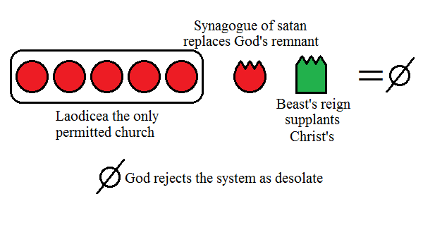 Lastly we see the repeated leavening process that with one satanic crown (worn by ten kings) used as the pale horse has lowered the standard of the church to the point that Laodicea is characterised more by false doctrine from the synagogue of satan (doctrine that has survived since Egypt) than of Christ - and is granted protection from the beast it rides if and only if it is in accord with the beast system itself. The ten kings strip the Church of all righteousness in Christ, by supplanting Christ as the moral compass of the Laodicean conglomerate. It becomes yet closer to the judgement of the scarlet beast and image where the Laodicean conglomerate is every bit as much the synagogue of satan as the single "church" of its namesake (which is the mouthpiece of the false prophet).