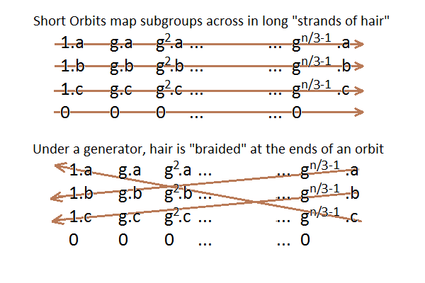 The "hair like women's hair" is explained by the orbits of the subgroups (as horses arrayed unto battle, or viewed side by side) and the elements of the field in that cycle as acted upon by a generator of the field's multiplicative group. In the following image, a short orbit of K4 subgroups is assumed, (and hence the orbit is short if F has a subfield of order four.) We see that at the ends of a cycle, the effect is much like braiding or appears as "women's hair".