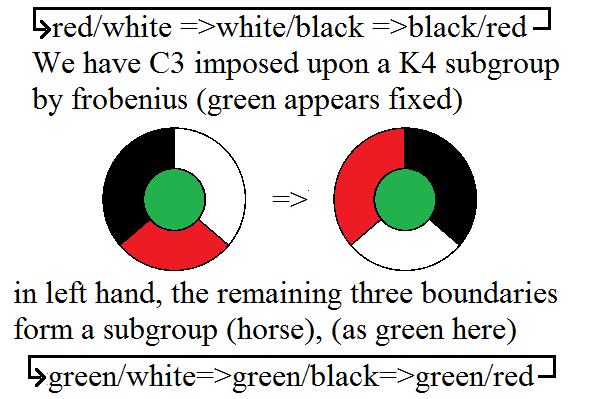 If we use our ultrafilter we can make unity; 1 = abcd, consequently we choose (ab,ac,bc) static as under frobenius (the subgroup in the right) and (ad,bd,cd) as also fixed, our "bow" for the white horse. Then "d" becomes our colour of the horse... The horse is not a "subgroup" per se,.. but in the left hand is in alignment with a subgroup of the right.
