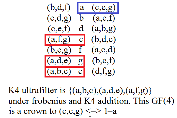 We have seen that a group of K4 subgroups in the octal can be as a field GF(4) - an ultrafilter under the action of frobenius upon that group. If a = 1 and (b,d,f) is held static then we may form our left and right hands upon those elements of the static group only, and without loss of generality we have both the left and right hands as a field isomorphic to GF(4). Thus on the right and on the left we have some sense of equality, as "crown". It is this crown on the left hand that we associate with the rider on the white horse. By "horse" we mean the subgroup in the left hand (In our case (c,e,g) if a=1 and (b,d,f) is fixed.)