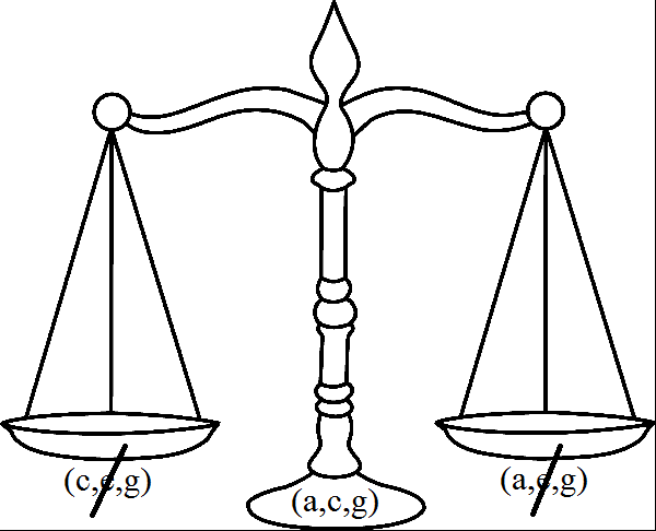 The black horse (a,c,g) = e = 1 facilitates this process. That which all three agree upon (the wine) is upon the table still, but the irreconcilable difference is that which they have in similarity, removing this is forcing a compromise. The position of the facilitator is then to arrive at the synthesis of (c,e,g) and (a,e,g). By removing the "oil" or the anointing for the receipt of a penny by absorbing the unity into cg and ag We then find a synthesis {acg}. g is not "opposed to the synthesis" - remember these are not groups but sets and leeched properties of the right hand.